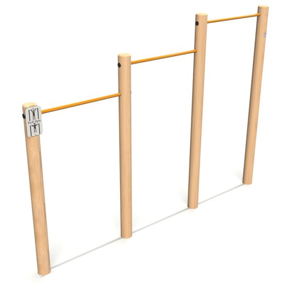 2.4m Chin Ups - L320 x W125 x H240cm. Using a combination of Timber, Rope, HDPE and Steel our Individual Fitness Items and units focus on fitness and agility in an outdoor environment. Our Fitness Stationsare designed to serve as multipurpose outdoor fitness units ideally suited for public parks to encourage adult users to improve their strength, fitness and overall health either by a planned visit or as part of their daily outdoor exercise routine. Minimum space required 7135mm x 4060mm