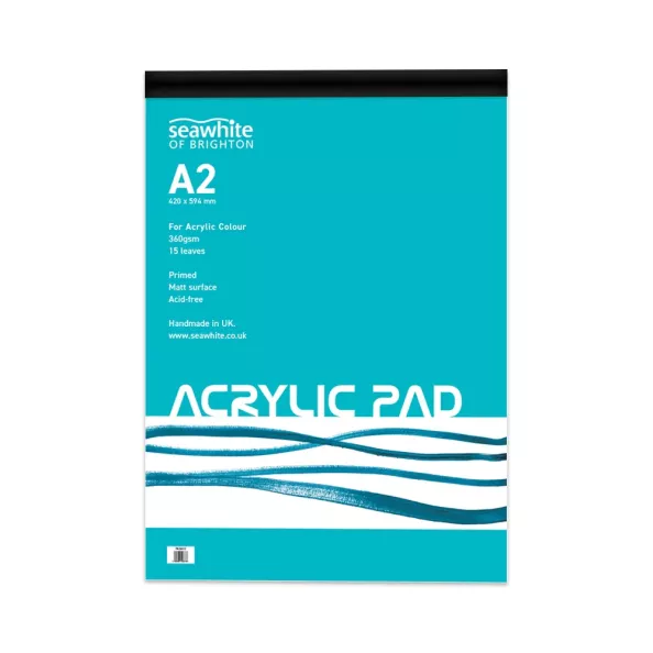 A2 Acrylic Painting Pad 15 sheets of 360gsm paper designed for acrylic paints 2mm board backing Modern design front cover Taped and glued on the short edge Made in the UK.