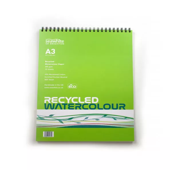 A3 Landscape Spiral Watercolour Pad 15 sheets of Seawhite 350gsm NOT finish watercolour paper White heavyweight paper with medium surface texture Requires no stretching 2mm greyboard backing Green design card cover Spiral binding on the short edge