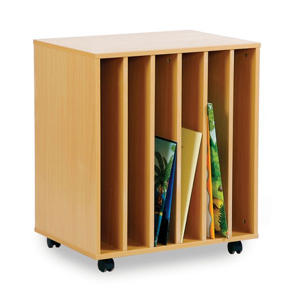 • Beech melamine unit stores books vertically in six slots • Available with castors or as pictured • W695 x D504 x H600mm
