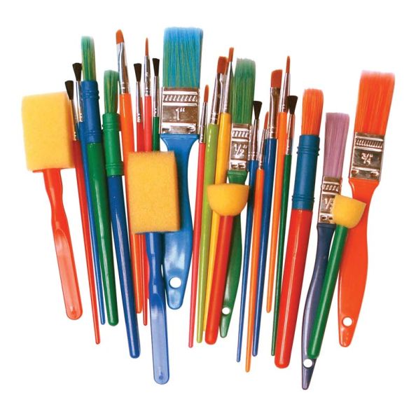 An assorted set containing foam dabbers as well as round and flat synthetic brushes in various sizes.