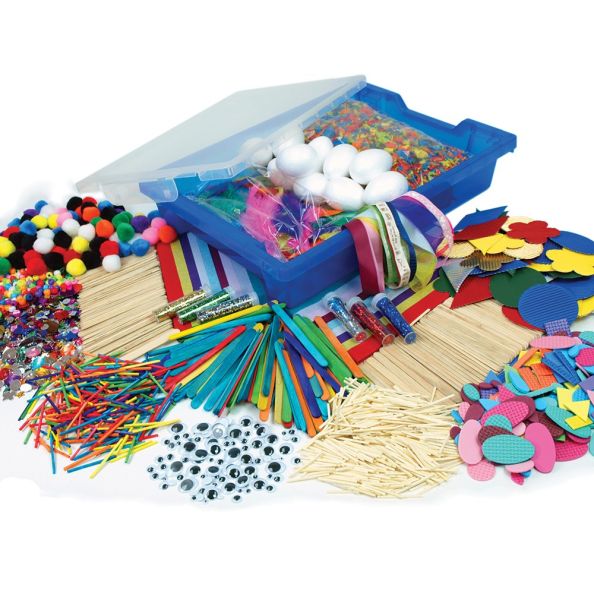 A stunning collection of craft items in a 75mm deep tray. Contains acrylic jewels, pony beads, coloured and plain matchsticks, EVA foam shapes, corrugated paper shapes, wood chippings, glitter ribbons, craft sticks, polystyrene shapes, feathers and tissue paper.