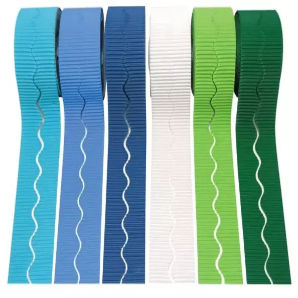 Selection of 6 cool colours of bordette rolls. 1 each of emerald, bright blue, rich blue, nile green, azure and white