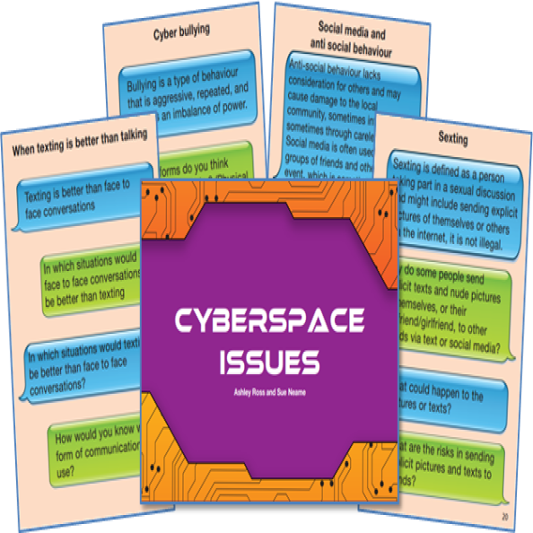 Texting in lessonsSocial chat roomsHomophobic bullyingRiotTexting in companySextingPlaying computer games at homeTalking face to faceMisuse of social networking sitesAgreeing school rules on use of mobile phones etcBanning electronic devices at homeA supermarket checkout situationTaking pictures in and out of school then posting them on social mediaCelebrities and social media.36 cards Ages 11-16 Key Stages 3 & 4 ISBN 978-1-909380-54-7