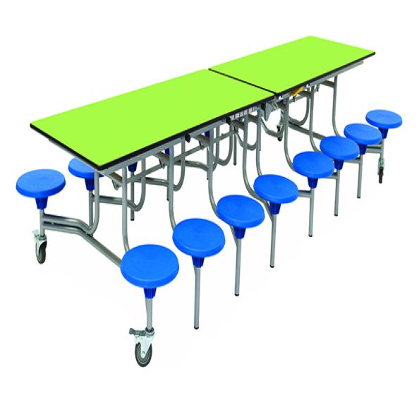 18mm MDF core top with hard wearing high-pressure laminate surface for high endurance Tops have a seamless edging making them moisture resistant and resilient to damage All moving parts are secured with locking nuts and bolts to prevent detachment over time Units come with patented centre lock bar system which includes override mechanism for compact storage and transit position for safe handling and set-up Choice of two heights (primary and secondary) The folding rectangular table is also available with 16 stools x H61cm for infant schools only 14 table top colours to choose from and 11 stool colours to choose from 15 year warranty on welds and mechanisms and lifetime warranty on all welded parts