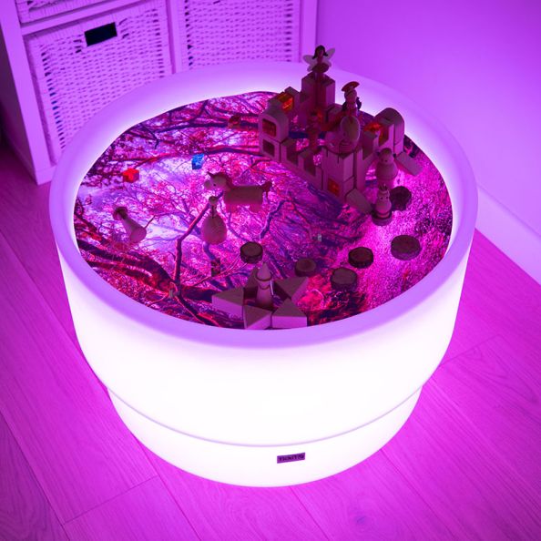 A beautiful and colourful forest playmat, clearly printed with highly detailed photographic imagery of a woodland path winding through a tunnel of trees. Makes a great base for imaginative play scenes with our Wooden Enchanted Figures, Woodland Trees and Woodland Trail sets. The playmat fits neatly inside our Sensory Mood Discovery Table and can also be used in our Sensory Mood Water Table or on any flat surface. Made from durable polyester, the mat is hard-wearing and waterproof - safe to use with wet or dry materials. It's an ideal accessory for small world play, story-telling and sensory exploration, and is easy to wipe clean. Due to its semi-translucent properties, the playmat works especially well on a light panel or mood table as the light will shine through, illuminating the images on the mat. The colour source chosen will affect the appearance of the mat in different ways: either by changing some of the scenery colours, intensifying the colours, or even making some of the colours appear to fluoresce - a fascinating way to explore colour whilst playing.
