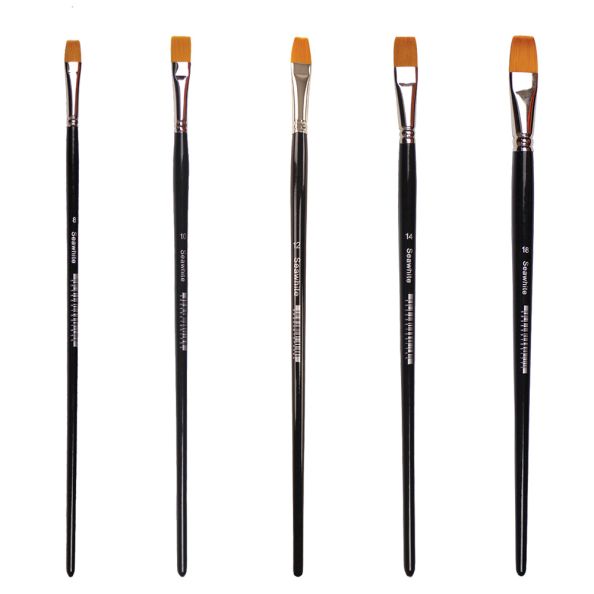 Golden Synthetic Starter Pack - Flat Versatile tapered brush with lovely spring Ideal for light and heavy paints Short Handles Pointed Tip 15 brushes 3 of each size: 8 10 12 14 18