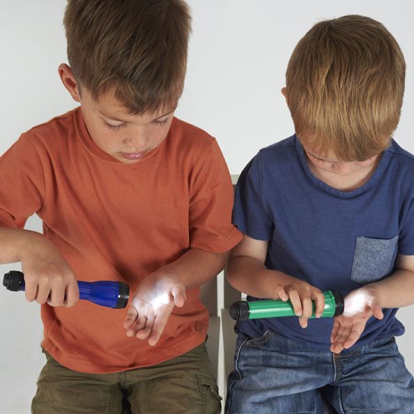 Energy efficient small handheld torches for classroom experiments. 3 x red, 3 x blue, 3 x green, 3 x yellow. Requires 2 x AA batteries (not included). Size: 160 x 33mm.
