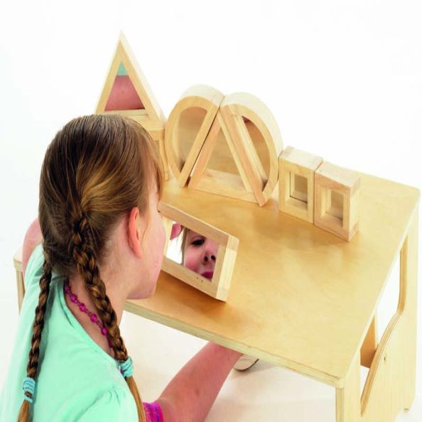 Comprises 8 large rubberwood pieces with double-sided acrylic mirror inserts. Ideal for shape recognition, for use on a light box, simple block building and for reflective pattern making.