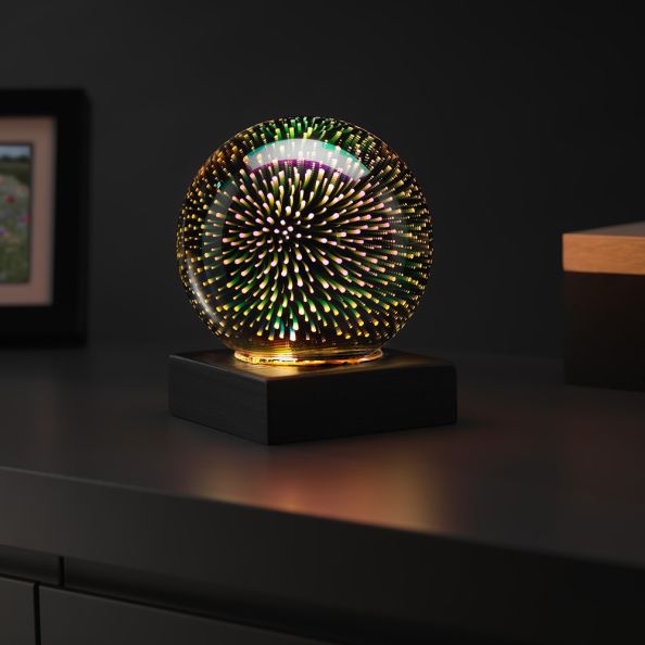 12cm diameter mirrored ball with LED starburst effect. USB adapter with on/off button along the wire. Black MDF plinth base. Size: Total height 15cm x 12cm diameter.