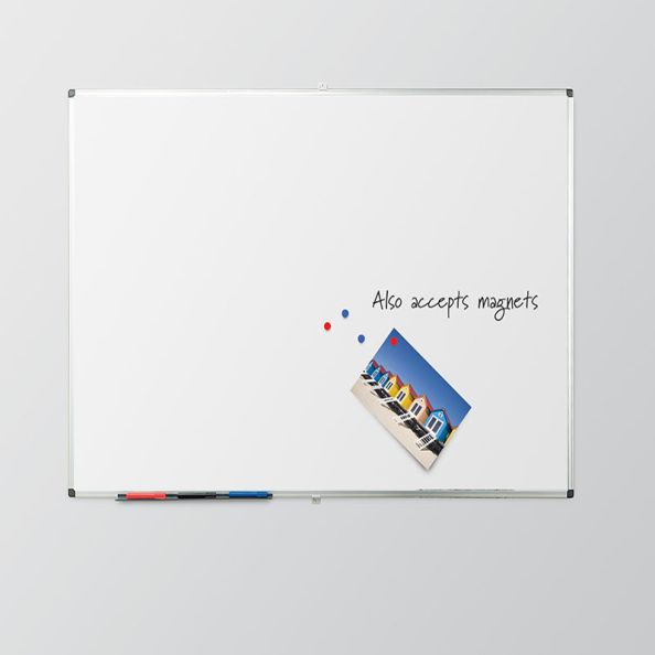Magnetic whiteboard constructed from coated steel. Satin silver anodised aluminium frame.