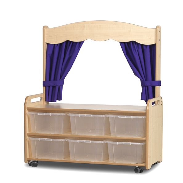 Mobile Storage Unit with Theatre Add on with 6 Clear Tubs and Purple Curtains