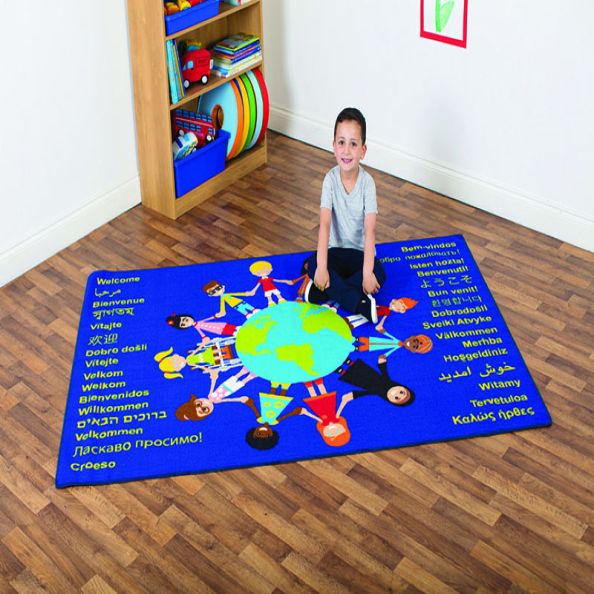 This highly visual carpet has a children around the world theme showing children from different cultures and the word “welcome” in multiple languages.