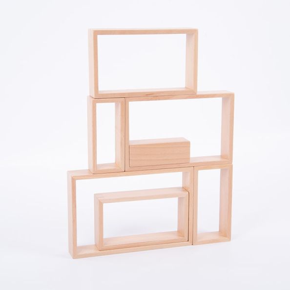 Beautiful smooth solid beechwood nesting rectangles in a natural finish to show the grain of the wood. The inner block is a solid 3D rectangular prism. Ideal for construction and imaginative play: to build towers and design rooms or outdoor areas for filling with small world play people or animals; applying mathematical logic to sort counters by colour or size; learning the geometric properties of rectangles; exploring size and scale; using mathematical terms - larger, smaller, taller, wider etc; and improving language skills and broadening vocabulary to describe their activities in action.