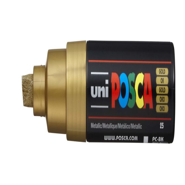 Uni Posca Broad Chisel Tip Paint Marker Vibrant water based paint which is smooth and fluid Permanent fade water resistant Versatile marker that will work on almost any surface Opaque and dense coverage can paint light on dark Colour: Gold. Tip: Chisel Size: 8mm Broad - PC-8K