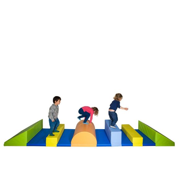 For children from 18 months to 3 years. Set includes 8 Pieces. Obastacles Mat - 200x 100 x 5cm, Rocker - 100 x 60 x 30cm, 2x Ramp - 100 x 50 x 30cm, 2x Large Prism 100 x 25 x 30cm, 2x Small Prism - 100 x 25 x 15cm. Dimensions: 400 x 100 x 30 cm