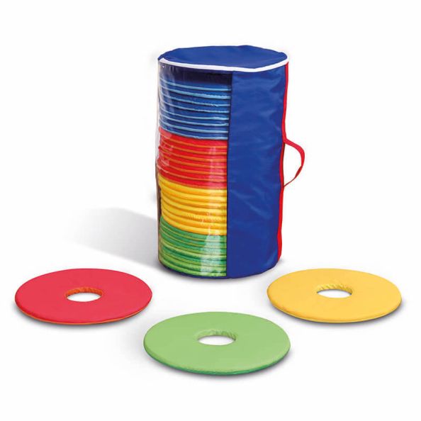 Brightly coloured soft cushions, suitable for indoor and outdoor use. Set of 32 versatile cushions which are suitable for indoor and outdoor use and can also be used for shape recognition. Cushions are washable at 30°C to help maintain an hygienic classroom environment. Includes storage holdall with handles making them easy to carry or move between locations. Excellent for sharing resources between classrooms. Circular Cushions