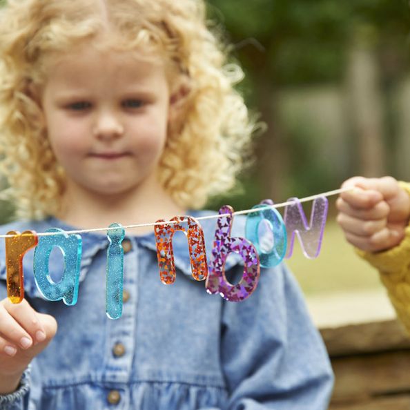 A set of 26 sparkling glitter lower case letters a-z in a child friendly font made from colourful translucent 3mm acrylic. The letters come in 7 colours, with the vowels in turquoise. Ideal for use on a light panel to make letter recognition interesting and exciting. Letters come with a 2.5mm hole at the top balance point so they can be strung up against a window or outdoors to create fascinating colour glitter shadows. The Rainbow Glitter Letters are the same size as our Rainbow Letters (72419) and the same colours as our Rainbow Glitter Numbers (72431) and Rainbow Glitter Shapes (72622) so can be used alongside either sets for extended learning.