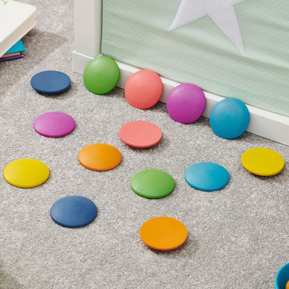 Beautiful smooth solid beechwood discs in the seven colours of the rainbow, with a natural finish to show the grain of the wood. Ideal for creating imaginative scenes, encouraging construction skills, counting and sorting, stacking and sequencing, pattern-making and learning about colour. The set matches our Rainbow Architect range, but can also be included in any loose parts collection or mixed and matched with our wooden heuristic play resources. This set contains 14 wooden discs with rounded tops and flat bases, 2 in each of the 7 rainbow colours. A lovely tactile resource that young children will enjoy learning how to roll, spin or even stack. Use for sorting, counting and colour recognition, or to enhance small world play scenes.