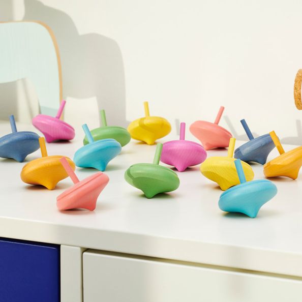 Beautiful smooth solid beechwood spinning tops in the seven colours of the rainbow, with a natural finish to show the grain of the wood.
