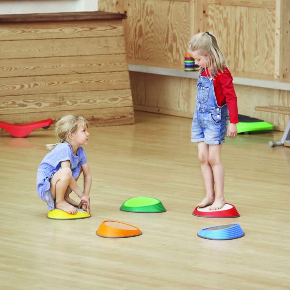 A set of 5 different tactile structures embedded into the classic River Stones design. Each stone features a different material, each creating a variety of tactile sensations. Cork is resilient and has a unique texture, Aluminium is lightweight and silvery, Foam will feel squashy when touched, TPE rubber is bouncy, and Concrete is hard and cold. The various tactile sensors experienced are hardness, temperature, roughness, or stickiness between the tactile stones. The slope of the surface increases pressure on the foot reinforcing the tactile stimulation. Suitable for free play as well as structured activities. Children can enjoy finding matching materials to the Tactile River Stones or describing out loud the sensation they are feeling when stepping along the stones.