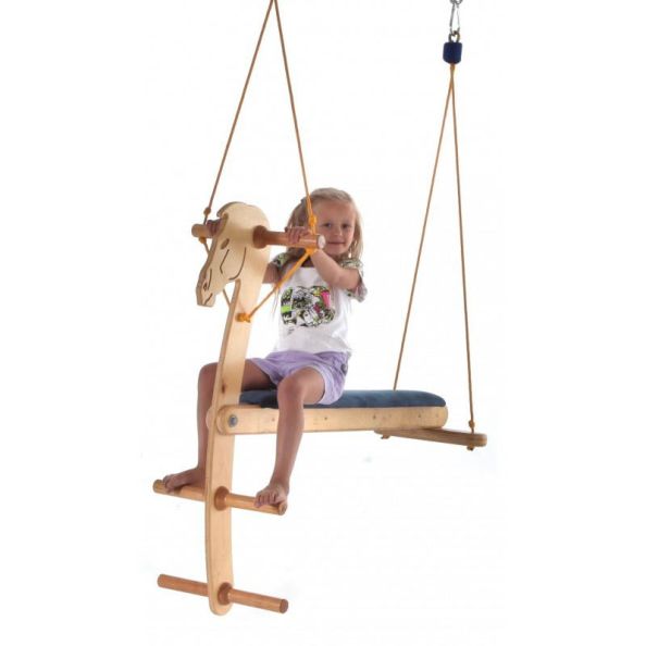 The rocking horse can be used by two children simultaneously. Includes heavy duty Carabiner for universal fitment onto any suitable frame or professionally fitted ceiling mount. During the exercise, thanks to its unique design, the children can independently propel its movement. When used by two children at once, getting the horse to rock is more challenging, as it requires them to co-ordinate their movement. It is used for developing bilateral motor co-ordination, balance reflexes, visuomotor co-ordination, tonic (especially labyrinthine) reflex integration, improving postural (flexor and extensor) muscle tone and general stimulation of the nervous system through strong activation of the vestibular and proprioceptive system receptors. A fun way of doingSensory Exercises and an essential part of any Sensory Diet prescribed by anOccupational Therapist. Product Purpose:?Sensory Integration Therapy Age: 2+ Maximum Load: 90kg Weight: 10 kg. Assembly:?Assembly required
