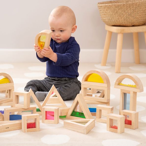 Our multi-award winning Sensory Block Set consists of 16 large rubberwood blocks containing beads, transparent acrylic, coloured sand and water/glitter filled pockets in 4 different shapes (square, rectangle, triangle and semicircle)