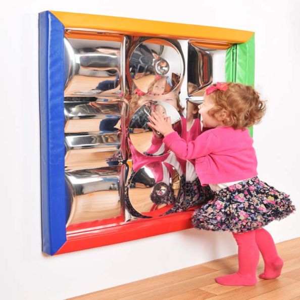 With convex/concave dips and curves our latest sensory mirror really does invite close inspection. Great for standing back with chuckles, this mirror is equally about encouraging children to get really close to actually find and examine their reflections which appear differently in the 9 facets moulded into the safety plastic