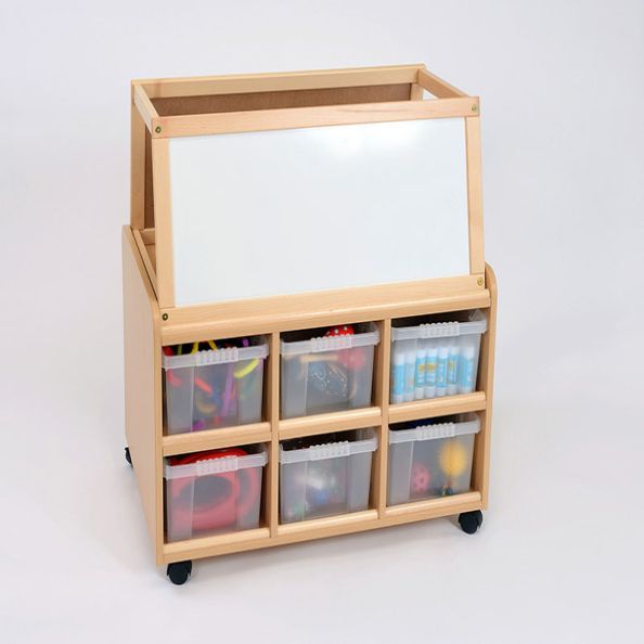 • Uniquely designed double sided units • Made from 18mm Beech Faced MFC with ABS Edging • The top of the units can be used as a Play Table • Solid beech frames surrounding the tops prevent items from rolling off onto the floor • One side has opening doors, or trays, reverse is open storage • Supplied flat pack with trays as shown • Dimensions W940 x D610mm. Accessories not included.