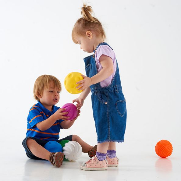 Six differently coloured soft plastic air-filled balls of the right size to enable toddlers and young children to hold them, examine them, play with them and to discover their differences. Set includes 6 balls with different distinctive surface textures.