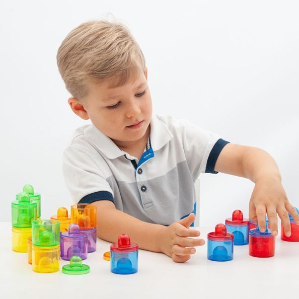 Small stackable lidded pots in 6 translucent colours, ideal for use in explorative play, for colour mixing and matching, and as a stacking activity to engage logic and develop coordination.