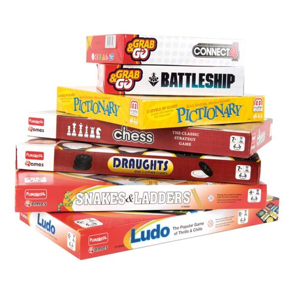 Lots of fun favourites that incorporate working individually, in pairs or as a group. Board games such as snakes and ladders and Uno are easy to play and great fun for any age, while developing competitive spirit and leaning to win, and lose, which is important for children.1 x Ludo 1 x Draughts 1 x Snakes and ladders 1 x Chess 1 x Pictionary 1 x Uno 1 x Battleships 1 x Connect 4